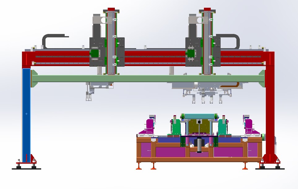 自動(dòng)排版機(jī)的主要功能單元有:玻璃輸送定位系統(tǒng)、抓取行走系統(tǒng)、視覺檢測(cè)系統(tǒng)、電控系統(tǒng)等;通過以上功能單元,實(shí)現(xiàn)了將自動(dòng)串焊機(jī)串焊好的電池串,按照工藝尺寸要求和排版方向順序自動(dòng)排版鋪設(shè)到玻璃(EVA已經(jīng)鋪設(shè))上,組成電池串陣列。玻璃/EVA通過傳輸線傳輸至指定位置,機(jī)械手抓取電池串實(shí)現(xiàn)CCD定位、自動(dòng)旋轉(zhuǎn)、自動(dòng)排版功能。設(shè)備通過同步帶傳輸與自動(dòng)生產(chǎn)線對(duì)接,實(shí)現(xiàn)了自動(dòng)流水作業(yè)。